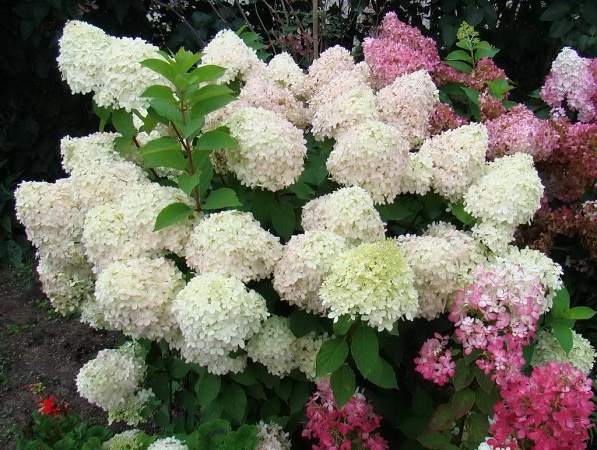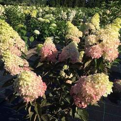Гортензия метельчатая Diamantino (Диамантино). Куст плотный, побеги прямые. Цветки стерильные, вначале жёлто-зеленоватые, затем белые, в конце цветения розовые. Аромат нежный. Соцветия очень густые, длиной 20 см. Цветение обильное, раннее, с конца июня до начала сентября. Сорт подходит для выращивания в контейнерах.