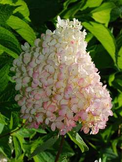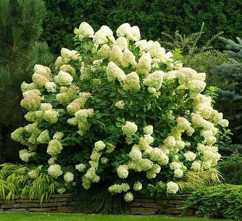 Гортензия Grandiflora (Грандифлора). Кустарник диаметром кроны до 3 м. Листья светло-зеленые до 16 см длиной. Цветки кремово-белые, до 2 см в диаметре, собраны в щитковидные соцветия до 20 см диаметром.