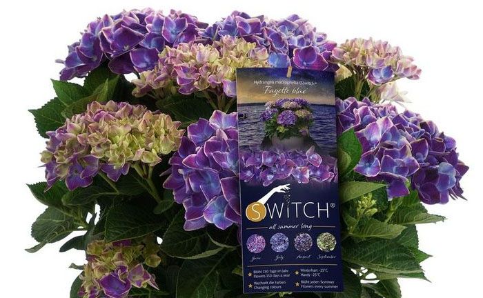 Гортензия Fayette Blue (Файет Блу). Относится к серии Switch. Особенностью серии является интересная изменчивость окраски цветков. С лета до глубокой осени они проходят четыре цветовых этапа - от фиолетового и голубого до серебристо-серого. Листья также интересны. В благоприятные годы они красиво окрашиваются осенью в бордовые, оранжевые и светло-зеленые тона.