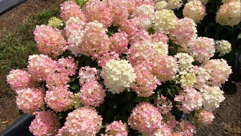 Гортензия FireLight Tiny Bit (Фаелайт Тайни Бит). Небольшой кустик в цвету покрыт соцветиями сверху донизу. Вначале цветки белые, затем к концу лета розовеют и краснеют. Высота 60-90 см, диаметр куста такой же. Осенью листья окрашивают в красный цвет, как известно, так "умеют" немногие метельчатые гортензии.