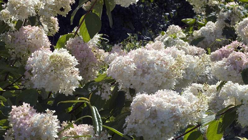 Гортензия метельчатая Grandiflora (Грандифлора). Цветки белые, потом розовеют, в основном стерильные, ароматные, собраны в крупные пышные метельчатые соцветия. Отличается большими размерами кустов с массой ветвей и очень крупными коническими соцветиями с большим количеством стерильных цветков.