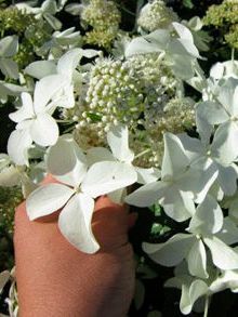 Гортензия метельчатая Levana (Левана). Мощный кустарник с огромными белыми соцветиями до 50 см длиной, состоящими из крупных стерильных цветков до 5 см в диаметре, которые обладают сильным ароматом. Отличается необычными крупными цветками, похожими на бабочку.