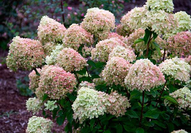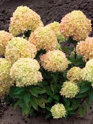 Гортензия Little Lime (Литтл Лайм). Карликовая мутация от сорта "Limelight". Соцветия в полутенистом месте светло-зеленые всё время, на солнечном месте осенью зеленовато-розовые.
