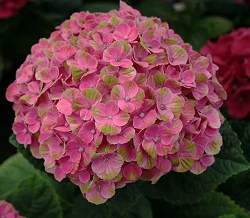 В течение всего периода цветения окраска цветков постоянно меняется. Вначале они бледно-зелёные, затем кораллово-розовые до розовых с фиолетовыми краями, потом цветки становятся зелёными с белыми краями. Цветки собраны в большие соцветия диаметром 20 см, которые отлично подходят для срезки. Побеги толстые, крепкие. Листья тёмно-зелёные.