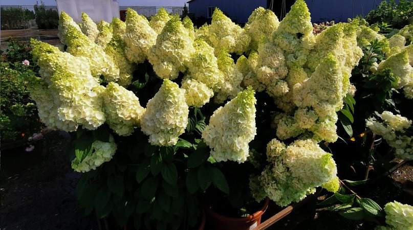 Гортензия метельчатая Magical Kilimanjaro (Мэджикал Килиманджаро). Куст высотой и диаметром 120-150 см. Стерильные цветки вначале светло-зелёные, затем в основании соцветия приобретают бело-кремовую окраску. Плодущие цветки почти незаметные. Соцветия красивые, плотные, конусовидные, длиннее, чем у сорта "Limelight", в них могут присутствовать листья. Цветение в июле-сентябре. Место солнечное или полутенистое. Почва влажная, дренированная. Зона 3 (до -34°С).