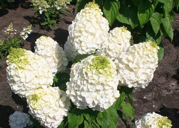 Гортензия метельчатая Magical Matterhorn (Мэджикал Маттерхорн). Пирамидальные соцветия с крупными стерильными цветками молочно-белого цвета, верхушка зеленая. Куст крупный. В высота 120 см. В диаметре около 150 см. Цветёт с июля по сентябрь.