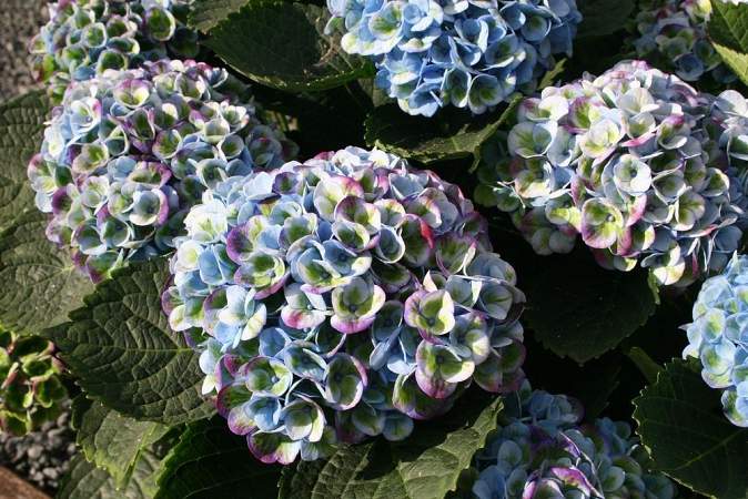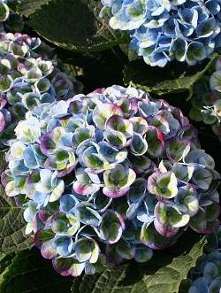 Гортензия Magical Revolution Blue (Мэджикал Революшн Блу). Цветки по мере цветения изменяют окраску от ярко-синей до зеленоватой с голубым и пурпурными пятнами и в конечном счете становятся зеленоватыми с фиолетовыми краями. Изменение окраски происходит неравномерно, поэтому соцветия очень необычные и красочные.