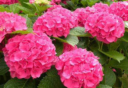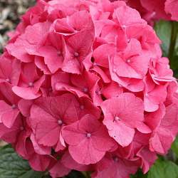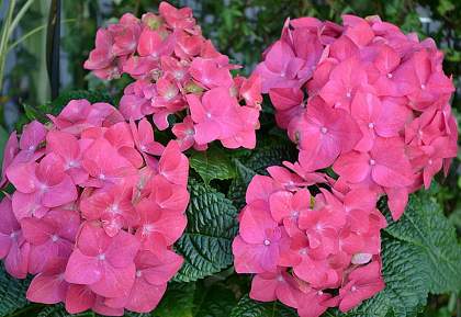 Гортензия крупнолистная Masja (Мася). Цветки очень крупные, в нейтральной почве тёмно-розовые или красные, в кислой — сине-фиолетовые. Соцветия шаровидные, очень крупные. Цветение обильное, в июле-сентябре на прошлогодних побегах.
