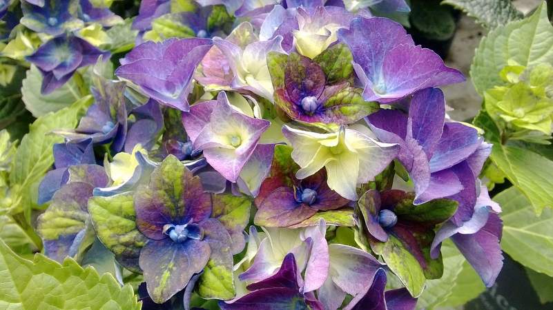 Гортензия Mata Hari (Мата Хари). Новый компактный сорт гортензии крупнолистной. Особенность в том, что соцветия окрашиваются не сразу, предъявляя нам необыкновенную игру оттенков от фисташковых, голубых до темно-фиолетовых. Соцветия украшают растение до полутора месяцев, потом начинают выцветать до серо-голубых. Но не спешите их срезать! Мата Хари готовит вам новый сюрприз — к осени эти же соцветия вновь приобретают яркую окраску — винно-красную. Осенью куст очень живописен — желтые листья, бордовые соцветия.