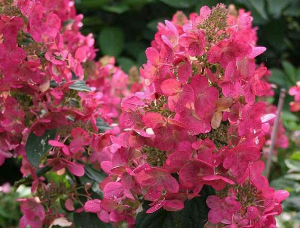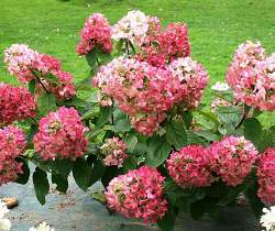 Гортензия Mega Mindy (Мега Минди). Прекрасный яркий сорт, нарастает быстро, цветет обильно и пышно. Высота куста до 170 см. Крона густая. Побеги крепкие, не гнутся под тяжестью соцветий. Цвети белые, краснеют. Соцветия конусовидные. Прекрасно стоит в срезке.