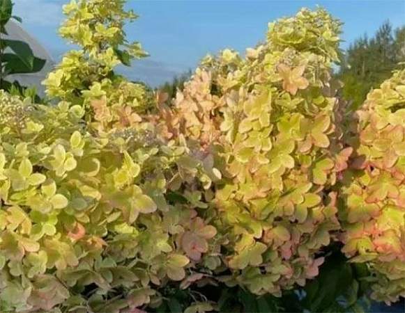 Гортензия метельчатая Metallica (Металлика). Новинка 2022 г. от французского селекционера Жана Рено. Соцветия с округлой верхушкой, очень крупные, длиной до 50 см, плотные, состоят из крупных стерильных цветков (до 5 см), с небольшим вкраплением фертильных. В начале цветения лепестки лаймово-белые, постепенно образуется розовая кайма, в финале цветения они становятся малиново-бордового цвета с характерным металлическим оттенком.