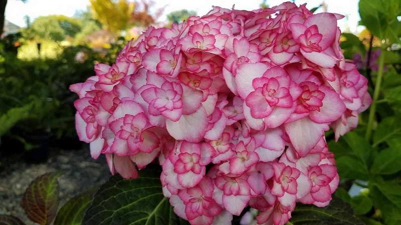 Гортензия Miss Saori (Мисс Саори). Очень изысканный и необычный сорт гортензии крупнолистной. Отличается восхитительной игрой цвета, цветки крупные, расположенные на красивых мощных стеблях. Этот изумительный сорт имеет темно-зеленую листву с фиолетовым отливом, которая прекрасно гармонирует с матово-белыми цветами, по краям которых розовая кайма.