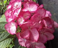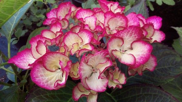 Гортензия Окская Весна. Листья крупные, темно-зелёные, овальные. Соцветия очень крупные, состоящие из больших цветков необычной окраски. Стерильные цветки белые с ярко-малиновой каймой, позже румянец заливает весь цветок. Цветет очень долго и обильно, с июля по сентябрь.