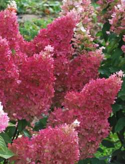 Гортензия метельчатая Petit Flori (Пети Флори). Высота до 80 см. Цветение очень ранее, с конца мая. Соцветия конусовидные, плотные, цветки в основном стерильные. Окраска цветков меняется с течением времени — от лаймового до кремового и вишнево-красного. Побеги темно-красные, крепкие. Цветение обильное до осени. Эта гортензия очень хороша для цветников, а также для выращивания в контейнерах на балконах и террасах.