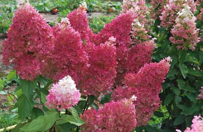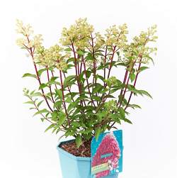 Гортензия метельчатая Petit Flori (Пти Флори). Высота до 80 см. Цветение очень ранее, с конца мая. Соцветия конусовидные, плотные, цветки в основном стерильные. Окраска цветков меняется с течением времени — от лаймового до кремового и вишнево-красного. Побеги темно-красные, крепкие. Цветение обильное до осени. Эта гортензия очень хороша для цветников, а также для выращивания в контейнерах на балконах и террасах.