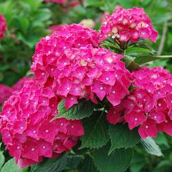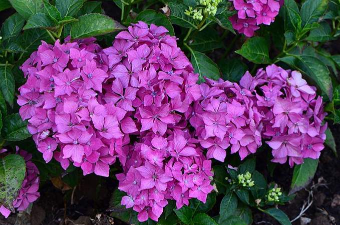 Гортензия Pia (Пиа). Очаровательный карликовый сорт. Высота 50 см, диаметр куста такой же. Цветки от розовых до фиолетовых, в зависимости от кислотности почвы. Соцветия шаровидные. Цветет довольно поздно, со второй половины лета до октября, на прошлогодних побегах. Очень хороша для выращивания в контейнерах.