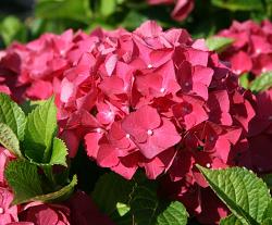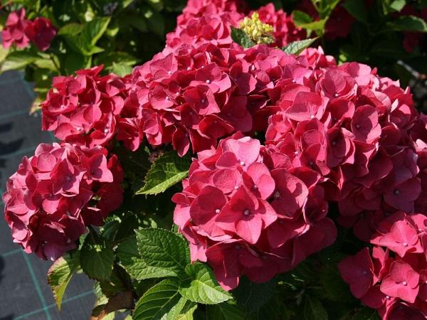 Гортензия крупнолистная Red Baron (Ред Барон). Цветки розово-красные в щелочной почве и фиолетовые в кислой. Лепестки зубчатые. Соцветия шаровидные. Цветёт в июле-сентябре на прошлогодних побегах.