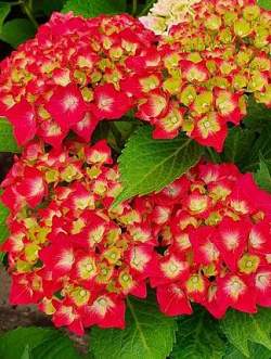 Гортензия Royal Red (Роял Ред). Цветки вначале с зелёным оттенком, затем ярко-красные, в крупных соцветиях. Цветение в июне-августе. Куст компактный, высотой 90-100 см. Рекомендуется для контейнерного выращивания. Место полутенистое. Почва влажная, богатая, дренированная.
