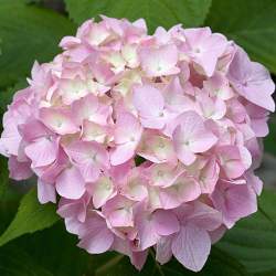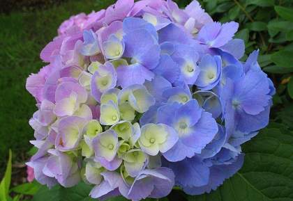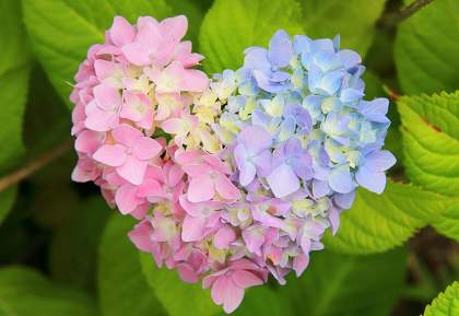 Гортензия Sharona (Шарона). Красивый сорт с нежной окраской. На одном растении могут соцветия с переливающейся от розового к голубому окраской. Соцветия крупные, до 25 см в диаметре. Цветет с июля по сентябрь на прошлогодних побегах. Высота около 100 см. На зиму требует укрытия.