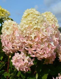 Гортензия Skyfall (Скайфолл). Очень крупные метелки при относительно невысоком росте. Цветки большие, гиацинтовидные, с удлиненными лепестками, вначале белые, затем бледно-розовые. Соцветия очень крупные, конические, со скругленной верхушкой.