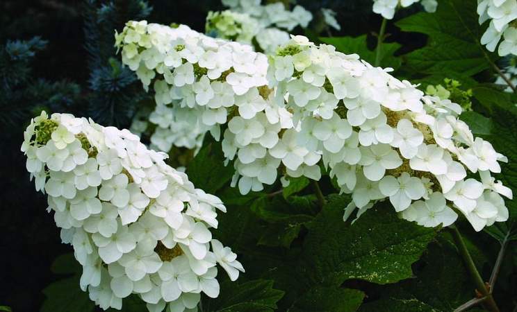 Гортензия дуболистная Snow Giant (Сноу Джайант). У данного вида листья не цельные, а 3-7 лопастные, похожие на листья дуба, откуда и произошло видовое название. Цветки белые, собраны в метельчатые соцветия. Поверхность листа темно-зеленая, нижняя часть — опушенная, бело-войлочная.