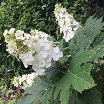Гортензия дуболистная Snow Queen (Сноу Квин). У данного вида листья не цельные, а 3-7 лопастные, похожие на листья дуба, откуда и произошло видовое название. Цветки белые, собраны в метельчатые соцветия. Поверхность листа темно-зеленая, нижняя часть — опушенная, бело-войлочная.