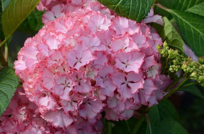 Гортензия So Long Sunny (Соу Лонг Санни). Цветки очень красивые, с лепестками, имеющими фестончатый край. По мере цветения усиливаются розовые цвета и появляются оттенки желтого. Образует компактный густой округлый куст. Очень прочные стебли.