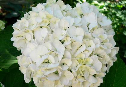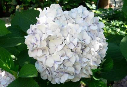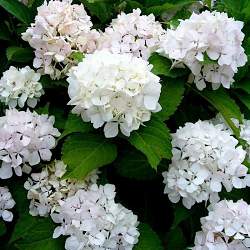 Гортензия Soeur Therese (Соер Терез). Цветки чисто-белые или с крошечным голубым глазком (если кислотность почвы высокая), осенью – бледно-розовые с зеленоватым оттенком. Соцветия диаметром 20 см. Цветёт на прошлогодних побегах в конце июня-августе. Высота и ширина 150 см. Место полутенистое. Почва влажная, дренированная. На зиму требует укрытия, как для роз.