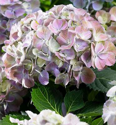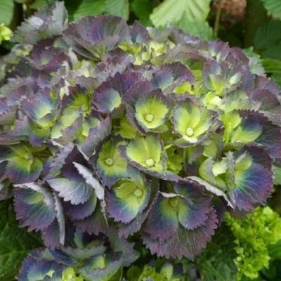 Гортензия Stramini (Страмини). Соцветия округлые, состоят из эффектных цветков биколор. На кислых почвах цветки в фиолетовые с зеленым, на щелочным — розовые с зеленым. Соцветие словно переливается, вмещая разные оттенки лайма, розового, сиреневого, фиолетового. Цветёт с июля до заморозков. Устойчива к заболеваниям. Высота 120 см.