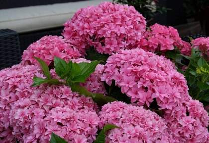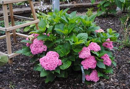Гортензия крупнолистная You and Me (Ю энд Ми). Цветёт на прошлогодних побегах и на побегах текущего года в июне-сентябре. Соцветия очень крупные, на прочных побегах, не поникают. Цветки яркого темно-розового цвета. На кислой почве фиолетовые. Куст высотой до 90 см.