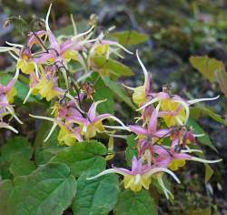 Горянка Fire Dragon (Фае Дрэгон). Цветки крупные желто-лиловые. Лепестки широкие. Соцветия свисающие. Цветение длительное. Листья вечнозелёные, короткие, глянцевые, тёмно-зелёные с зазубренными краями, высотой 25 см. Цветоносы высотой 35 см. Почва плодородная, влажная, дренированная, зимой — сухая. Местоположение — полутень.