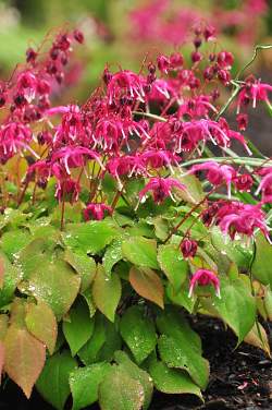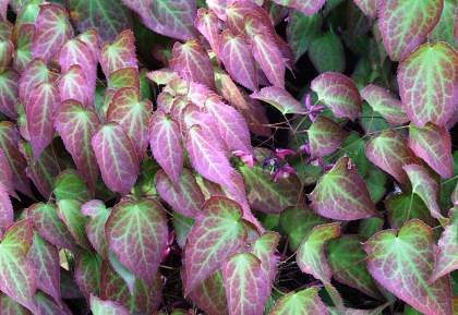 Горянка красная. Декоративна в течении всего сезона благодаря ярко-красной окраске листьев весной. Цветет красными цветками. Молодые листья красные, затем зеленеют. Летом листья зеленые с небольшим красным окаймлением. Образует очень плотный напочвенный покров. Растет даже в глухой тени.