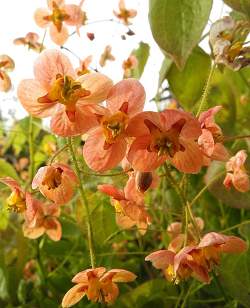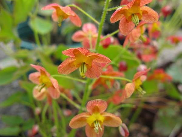 Горянка Orangekonigin (Оранжкёнигин). Листья вечнозеленые, осенью красноватые. Цветки необычного медно-оранжевого цвета. Разрастается быстро, образует куртины. Высота растения в цвету около 45 см. Под зиму растение мульчируют.