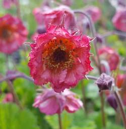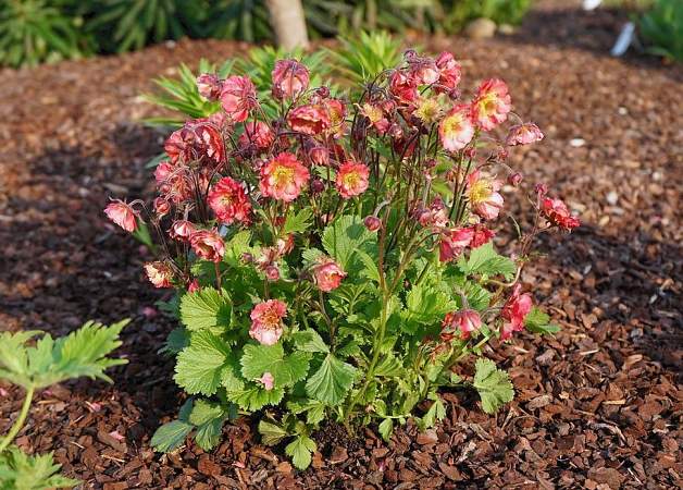 Гравилат Bell Bank (Белл Бэнк). Невысокий сорт с очаровательными кораллово-розовыми цветками. Бутоны коричневато-фиолетовые, цветки сначала колокольчатые, потом раскрываются. Стебли фиолетовые. Высота в цвету 45 см. Компактная кочка.