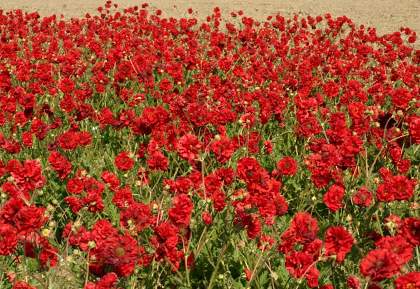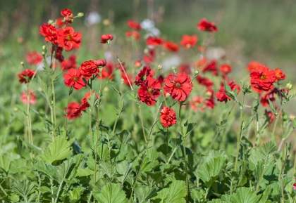 Гравилат Blazing Sunset (Блейзин Сансет). Цветки одиночные или собраны в метельчатые или щитковидные соцветия, очень крупные, махровые, алые. Это вечнозеленое растение подходит для солнечных и слегка затененных мест, после цветения на нем образуются красивые головки с семенами. Листья в прикорневой розетке, непарноперистые. Цветет с конца июня в течение 50 дней.