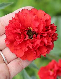 Гравилат Blazing Sunset (Блейзин Сансет). Цветки одиночные или собраны в метельчатые или щитковидные соцветия, очень крупные, махровые, алые. Это вечнозеленое растение подходит для солнечных и слегка затененных мест, после цветения на нем образуются красивые головки с семенами. Листья в прикорневой розетке, непарноперистые. Цветет с конца июня в течение 50 дней.
