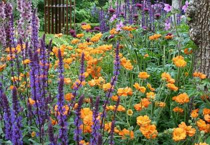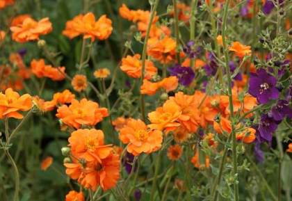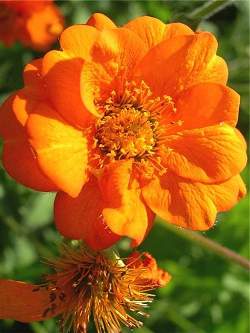 Гравилат Fireball (Фаеболл). Цветки полумахровые, оранжевые. Прикорневые листья опушенные, тёмно-зелёные, высотой 30 см. Стебли бордовые, высотой 60 см. Почва влажная, дренированная, удобренная.