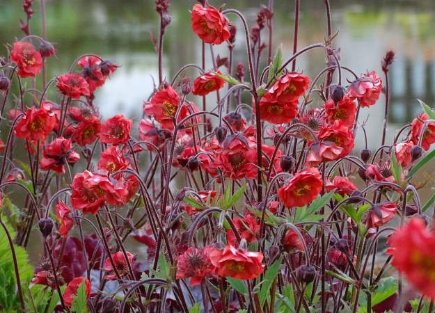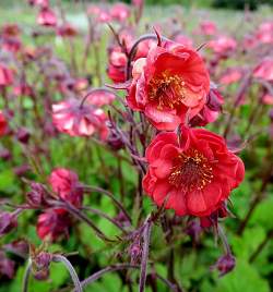 Гравилат Flames of Passion (Флеймз ов Пэшн). Изящный сорт. Цветки полумахровые, собраны в небольшие соцветия или одиночные, на пурпурных цветоносах. Окраска бруснично-красная. Цветет повторно — с мая по ноябрь. В умеренных регионах листья сохраняются всю зиму. Высота до 50 см.