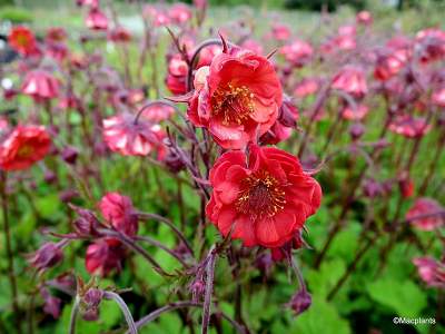 Гравилат Flames of Passion (Флеймз ов Пэшн). Изящный сорт. Цветки полумахровые, собраны в небольшие соцветия или одиночные, на пурпурных цветоносах. Окраска бруснично-красная. Цветет повторно — с мая по ноябрь. В умеренных регионах листья сохраняются всю зиму. Высота до 50 см.