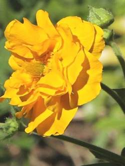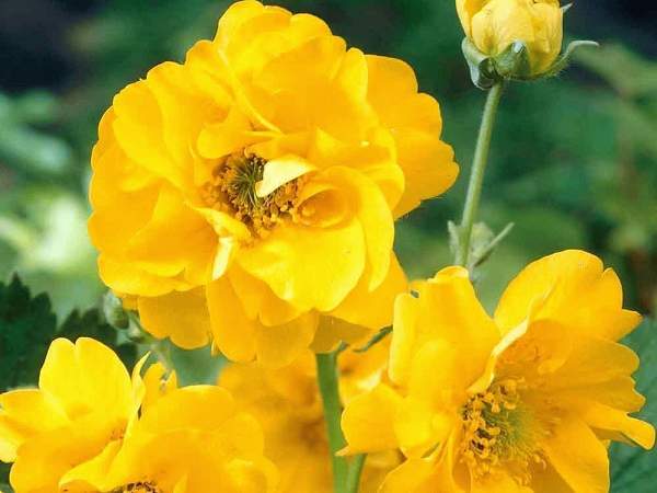 Гравилат Goldball (Голдбол). Цветки махровые с ярко-желтыми лепестками. Пышные соцветия распускаются в конце июня и остаются на кустах в течение 50 дней.