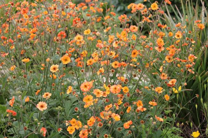 Гравилат Totally Tangerine (Тотали Тэнжерин). Цветки мандариновые, стерильные. Цветение очень продолжительное, несколько месяцев. И очень обильное. Высота около 80 см. Почва любая, кроме сырой и закисленной. Гравилат светолюбивое растение, но может переносить и слабое затенение. На зиму желательно забросать листьями.