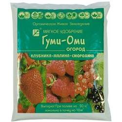 Гуми-оми земляника клубника малина смородина. Органоминеральное удобрение с микроэлементами. Применяется для питания растений, повышения урожайности, повышения плодородия и улучшения структуры почвы, улучшения качества продукции. В состав входят: компост на основе куриного помета, азот, фосфор и калий удобрения, микроэлементы — бор, медь и удобрения Гуми.