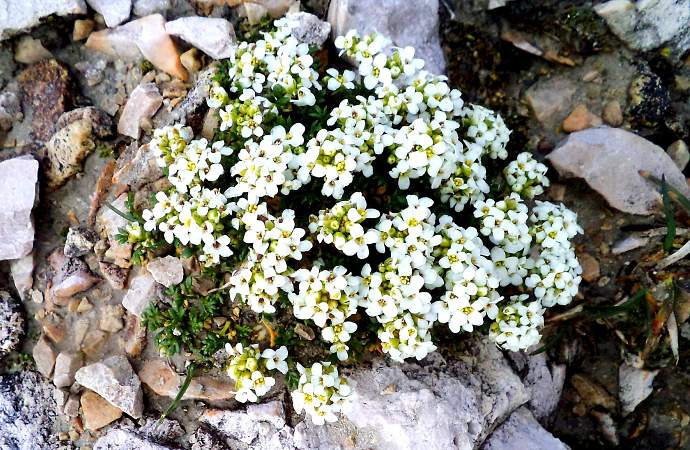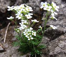 Гутчинзия альпийская. Родом из высокогорных областей Европы. Образует густые низкие заросли. Мелкие листья темно-зеленого цвета. На тонком стебле расположено густое соцветие — кисти, состоящие из мелких белых цветочков. Растение высотой 5—10 см. Развивается на проницаемой дренированной почве, богатой кальцием.