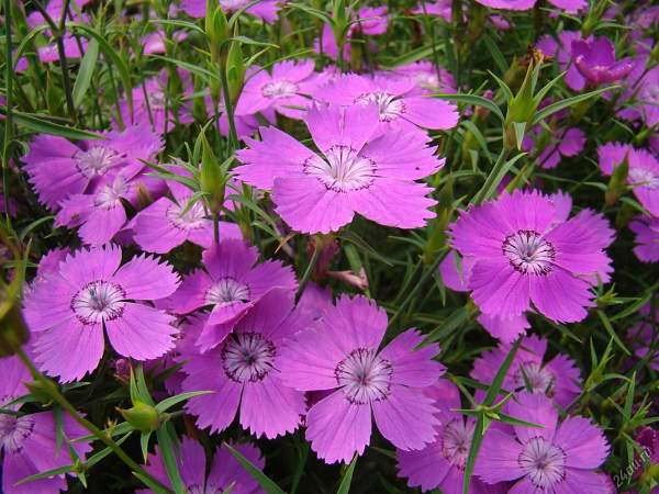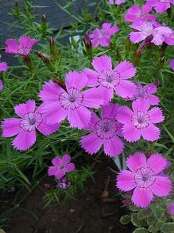 Гвоздика амурская. Многолетнее низкорослое растение высотой 20-25 см с сизыми листьями. Цветки изящные розовые с темным пятном в середине, довольно крупные, до 4 см в диаметре. Массовое цветение в июне-июле, одиночные цветки появляются вплоть до сентября.