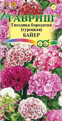 Гвоздика бородатая (турецкая) Байер махровая смесь. Травянистое растение с многочисленными узловатыми стеблями высотой 50-60 см. Цветет в июне-июле. Душистые цветки разнообразной окраски собраны в плотные соцветия диаметром 8-12 см. Предпочитает освещенные участки с легкими плодородными почвами, может расти в полутени. Зимостойка. Семена высевают в открытый грунт в мае-июне. Сеянцы пикируют или продергивают по схеме 5х5 см, расстояние между взрослыми растениями 25-30 см. Используют для оформления участка и получения срезки.