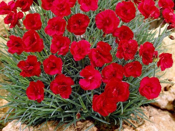 Гвоздика David (Давид). Образует компактную густую подушку из серо-зелёных зимующих листьев высотой 20 см. Цветки махровые, красные. Цветоносы высотой 40 см.