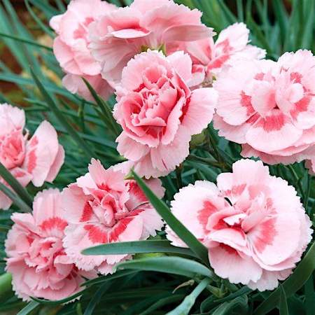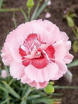Гвоздика Doris (Дорис). Один из самых популярных сортов среди гвоздик. Ее нежно-розовые махровые цветоки с малиновым пятнышком в центре замечательно гармонируют с сизо-голубой игольчатой листвой. Восхитительного аромата!