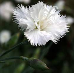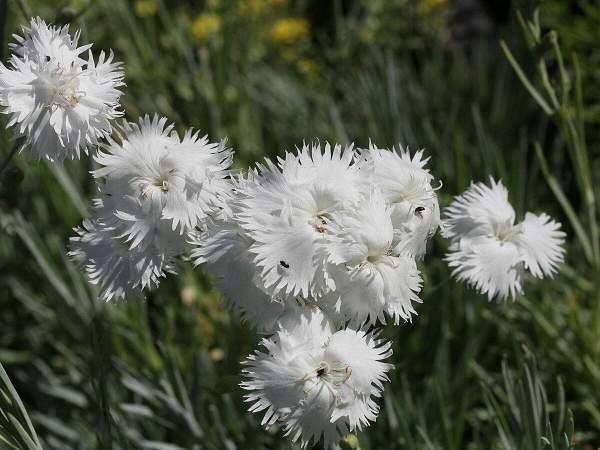 Гвоздика перистая Albus (Альбус). Цветки белые, простые или полумахровые, с сильно рассеченными фестончатыми лепестками. Листья серебристые. Куртина плотная, в цвету достигает 25 см. Цветение невероятно обильное. Великолепно смотрится с пионами. Имеет очень сильный горько-сладкий гвоздичный аромат.
