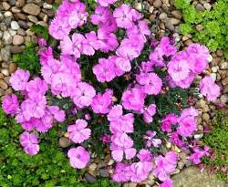 Гвоздика перистая Dinetta Pink (Динетта Пинк). Листья сизо-зеленые, голубоватые, цветки полумахровые, розовые. Многолетнее травянистое растение. Высота растения 20-30 см. Гвоздики предпочитают хорошо прогреваемые южные склоны, легкую песчаную почву. Они мирятся с недостатком питательных веществ в субстрате, а если их слишком обильно подкармливать и поливать, начинают болеть, в результате снижается их морозостойкость. Необходим хороший дренаж — гвоздики не любят вымокания.