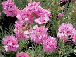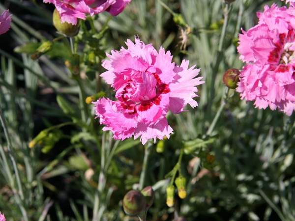 Гвоздика перистая Maggie (Мэгги). Высота около 20 см. Образует подушки из узких листьев с сильным сизым налетом. Цветет в июне-июле розовыми махровыми цветками. В основании лепестка красное пятно. Засухоустойчива. Хорошо разрастается на солнечных участках.